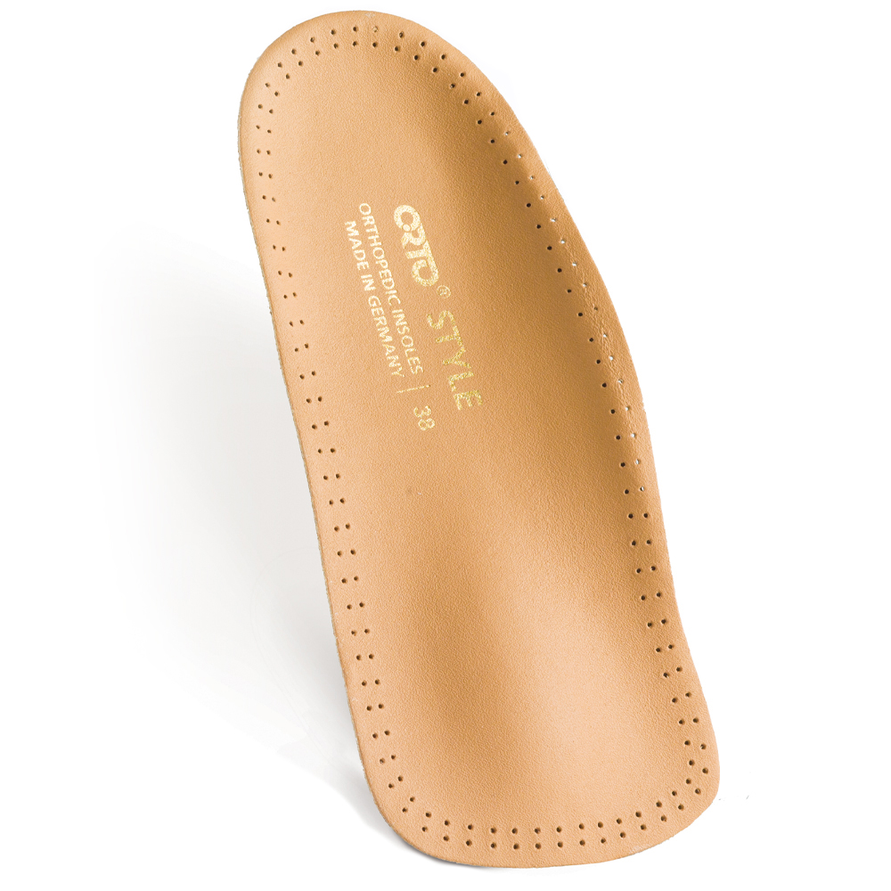 Бескаркасные ортопедические полустельки с выкладкой продольных сводов и небольшим метатарзальным валиком. Имеют смягчающий слой с перфорационными отверстиями по подошвенной поверхности. Покрытие изготовлено из натуральной кожи.
